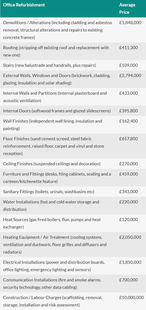 The following office refurbishment and office renovation costs are at the higher end of the industry scale to make sure you don’t underestimate your budget and give an idea of just how much the best in the business might set you back: